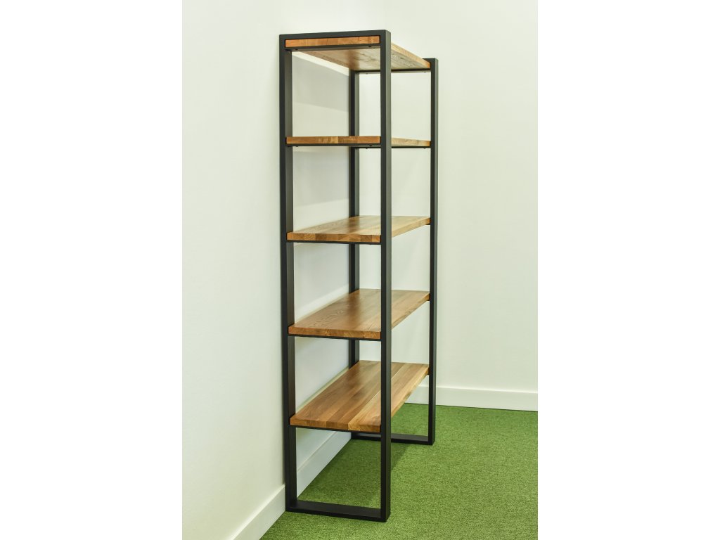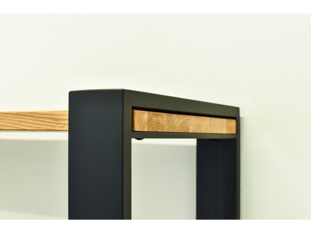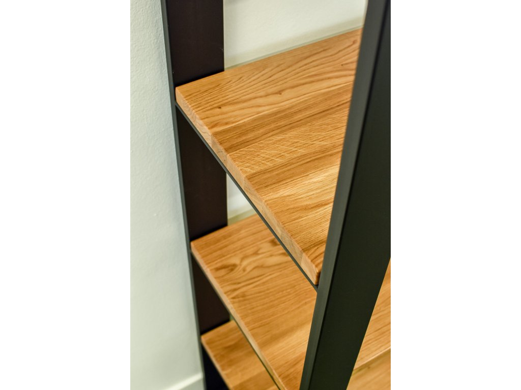 Policový regál je vyrobený z pevné ocelové konstrukce a masivní dubové desky o tloušťce 40 mm, která je velmi tvrdá a odolná. Desky jsou ošetřeny přírodním Osmo olejem.